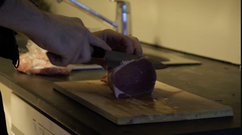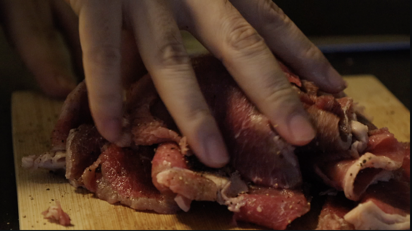 半解凍で切ると切りやすいと言いますが、今回は刺身包丁を使って薄切りにしていきました。厚みに関してはそれほど神経質になる必要はありませんが、分厚すぎると仕上がりが固くなりますし、薄すぎると物足りなくなるかもしれません。