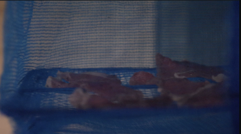 肉通しが重ならないように気をつけて、干し籠に広げ、数時間から半日ほど干して水分を飛ばします。