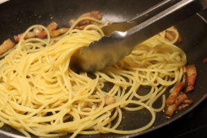 - 茹で上がったパスタを加えて、パンチェッタとその脂をしっかりとパスタに纏わせる。
