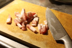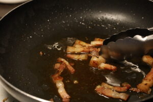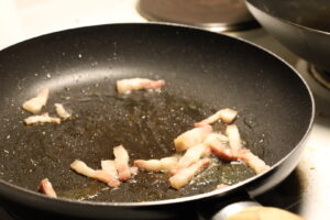 - フライパンにオリーブオイルを敷き、パンチェッタの油が溶け出し、表面に焼き色がつくまでじっくりと炒める。