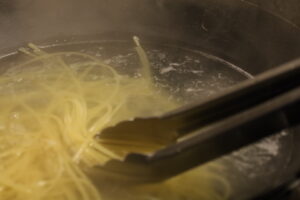 - 鍋に塩水を沸かし、パスタを茹でる。