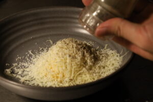 - 皿に盛り付け、最後に再びブラックペッパーを挽き散らして完成。