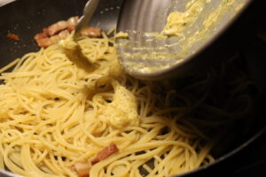 - パスタをフライパンの上でなるべく広く薄く広げ、卵液を回し入れ手早く絡めていく。卵液が熱で凝固しないように気を付ける。