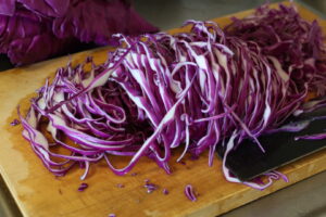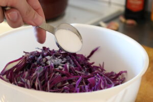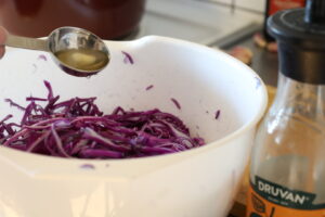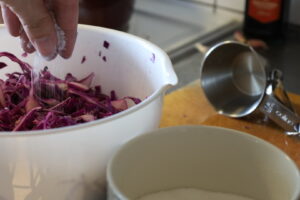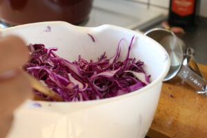 2. 千切りにした紫キャベツをボウルに入れ、塩を加える。塩が全体に満遍なく行き渡るようにしっかりと混ぜる。*好みでこの段階で5-10分置いて、キャベツから出る水分を捨てても良い。