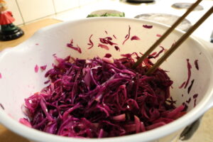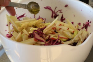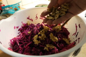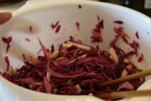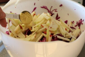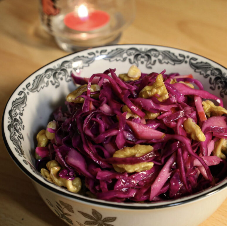 スウェーデン風の紫キャベツのサラダ。リンゴとくるみを入れて味わいと風味にアクセントを添える。
