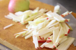 2. 冷蔵庫で寝かしておいたキャベツのボウルにりんごを移す。