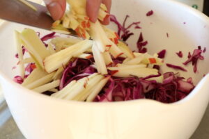 紫キャベツのサラダは他にもいろいろなバリエーションがありますが、りんごとの組み合わせは定番中の定番。りんごの酸味と甘みがサラダに程よいアクセントを与えます。
