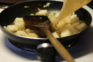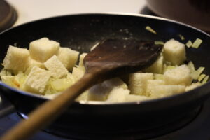 6. 賽の目に切ったパンを加えて、バターを満遍なく吸わせるようにして軽く炒める。パンに比べて明らかにバターが不足しているような場合は適宜バターを追加する。
