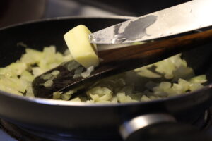 5. バターを加えて、焦がさないように注意して溶かし、玉ねぎと合える。