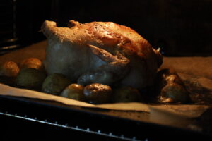 3. オーブンを200度に予熱し、丸鶏を皮目に香ばしく焼き色がつくまで焼き上げる。この際、付け合わせの野菜(じゃがいもなど)を一緒に焼いておくと、鶏の旨味と油を吸って美味しく焼き上がる。