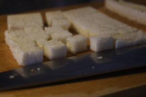 3. パンは1cm角ほどの賽の目に切る。