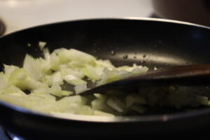 4. フライパンに薄く油を敷き、玉ねぎを半透明になるまでじっくりと炒める。