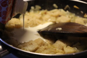 9. さらに、牛乳、生クリームを加え、木べらでパンを優しく潰すようにしながら軽く撹拌していく。