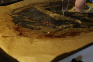 7. 丸鶏を焼いた鉄板(あるいはオーブンペーパー)に水(あるいは白ワインでも可)を注いで、焼き付いた鶏肉の油や旨味を溶かし出す。