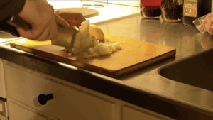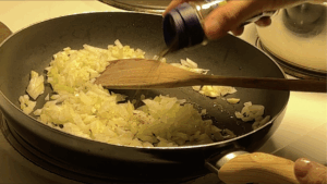 1. みじん切りにした玉ねぎを油を敷いたフライパンに加え、塩とタイムをふたつまみずつ加えて、透き通るまで炒める。