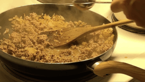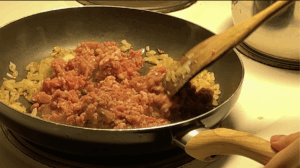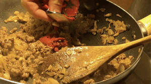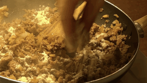 2. 粗挽きにしたラム肉を加えてさらに炒める。すぐに崩して炒めるのではなく、ある程度 塊のまましっかりと焼いていく。