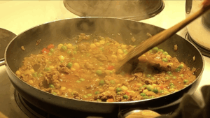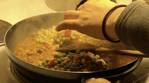 7. 冷凍野菜を加えて、満遍なく混ぜる。