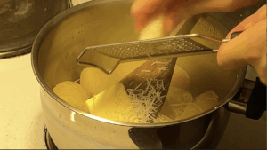 9. 茹で上がったじゃがいもの皮を剥き、バター10gとパルミジャーノレッジャーノ10g、塩ふたつまみほどと共に鍋に加えて、マッシュポテトにする。