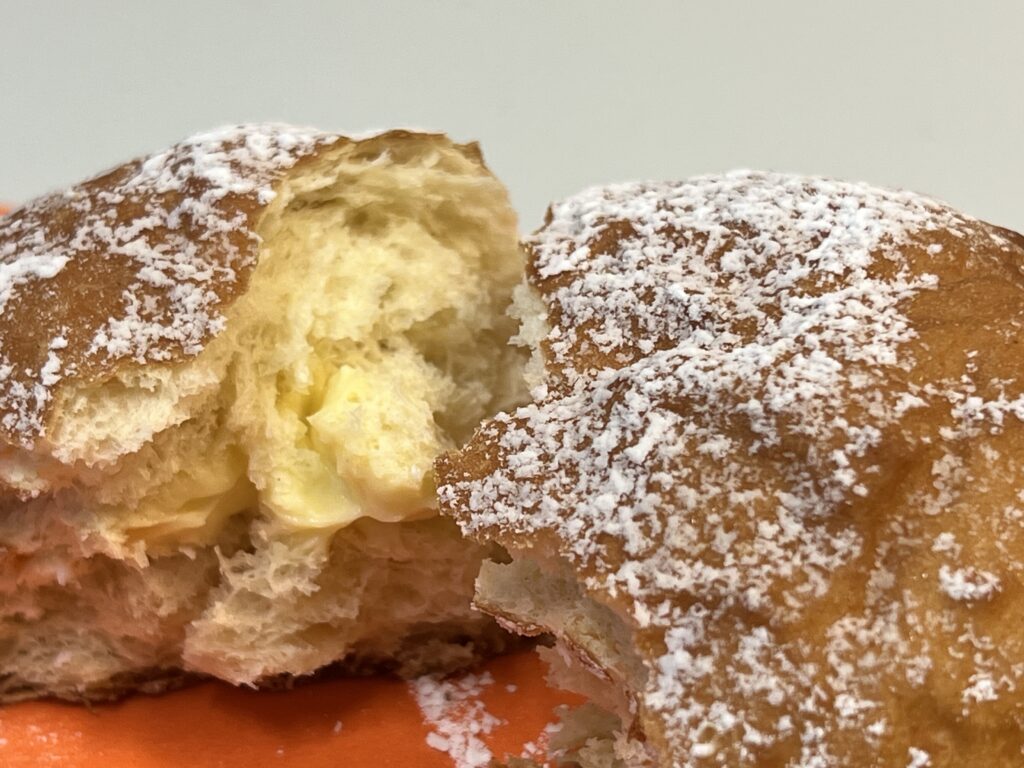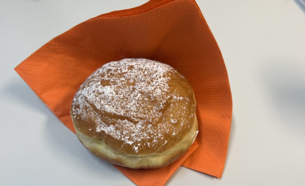 “Solboller”はカルダモン練り込まれたイースト生地(日本の”あんドーナツ”の生地に似ています)にジャムやバニラクリームなどを詰めた菓子パンで、太陽に見立てているのか必ず表面に粉砂糖などの白い粉がまぶしてあります。